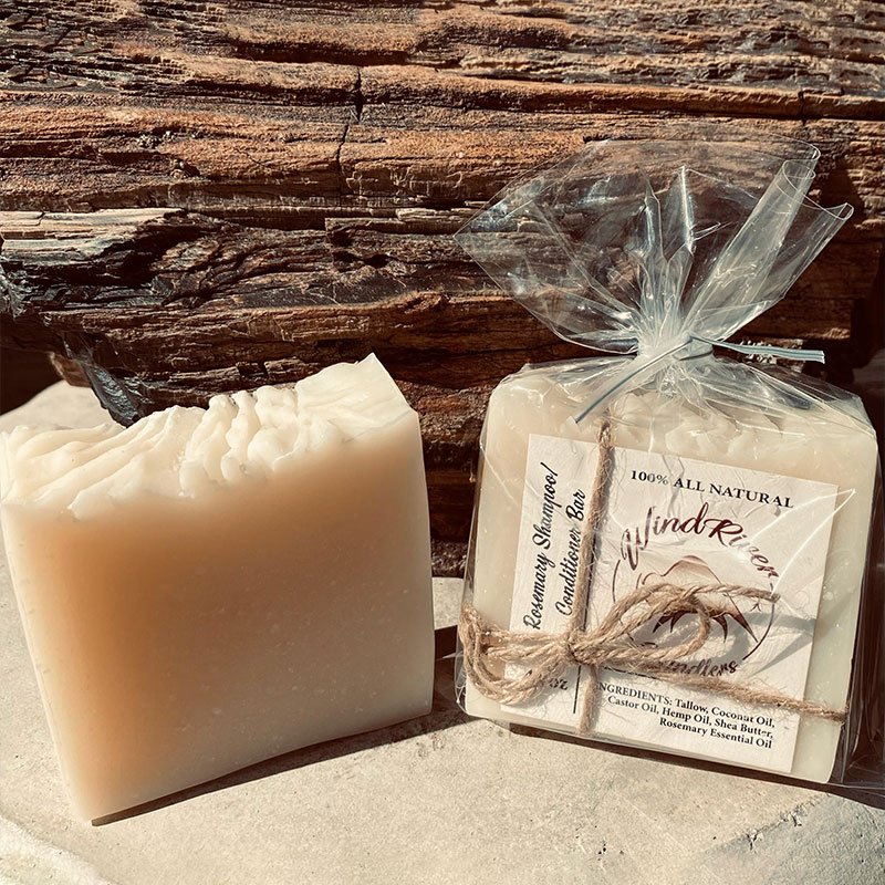 Our Shampoo/Conditioner Bar has raised the bar. Everyone has been asking for a shampoo/Conditioner Bar in one and we have finally created a bar that cleans, heals, protects and stimulates hair growth all in one. This bar doesn’t leave your hair dry or greasy. Its sudsy bubbles smell amazing. Our combination of Tallow, Coconut Oil, Hemp Oil, Shea butter, Castor Oil and Rosemary Essential Oil is 100% natural and sustainable. Rosemary stimulates hair follicles to increase hair growth and thickness. This Shampoo/Conditioner Bar does it all in one.